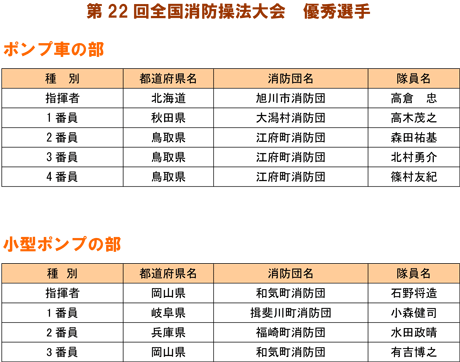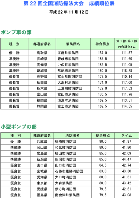 2010年11月12日 第22回全国消防操法大会が愛知県蒲郡ボートレース場にて開催されました。 本県からは8月22日の県大会で優勝した荒尾市の荒尾市消防団が出場しました。 熊本県民の附託に応え、気象条件の悪い中、健闘しました 。 以下、荒尾市消防団の活躍をご紹介します。